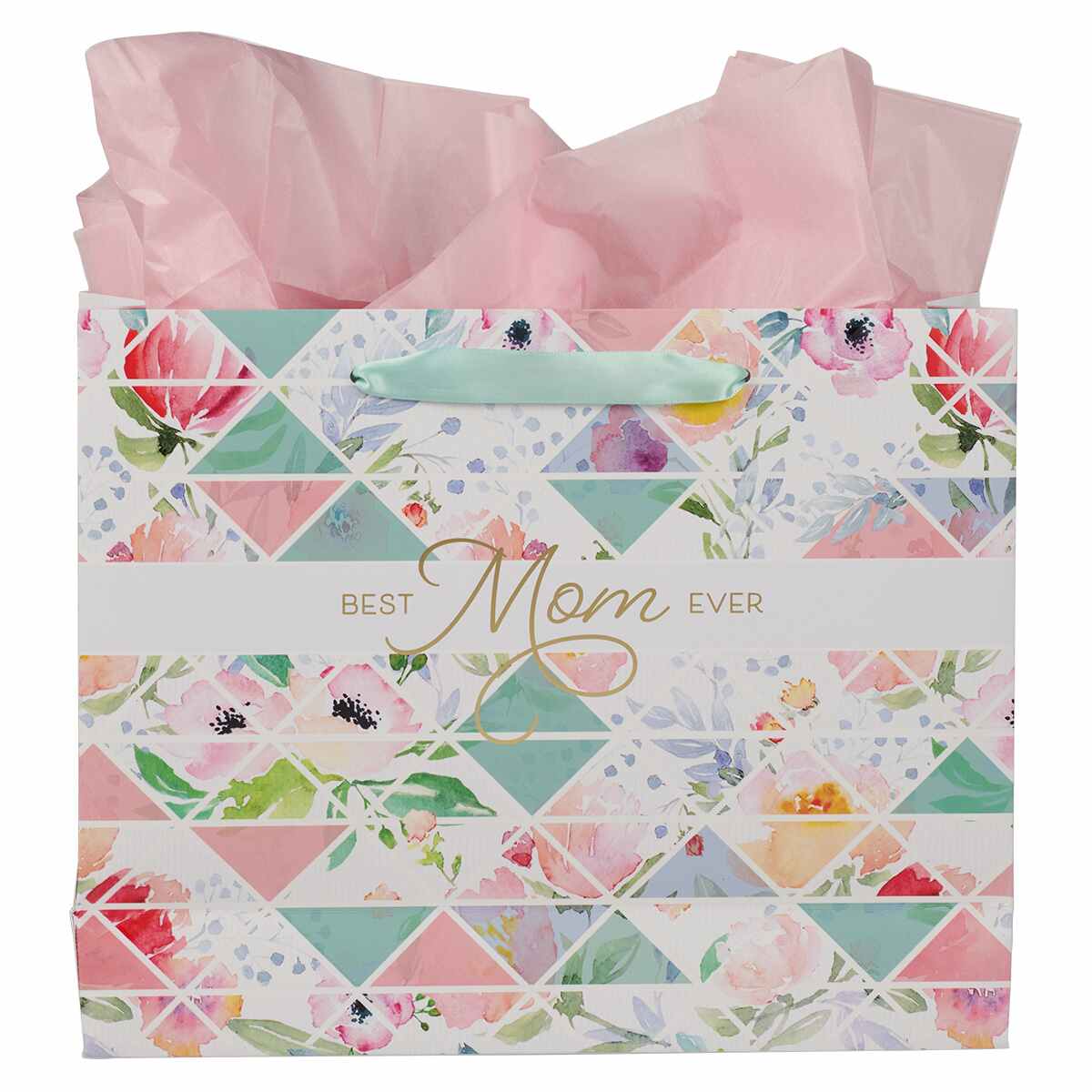 Celebrate the best mother in the world when you wrap her gift in the Best Mom Ever Pastel Diamond Large Landscape Gift Bag with Card and let her know you appreciate everything she has done for you. Pastels and florals plotted on a diamond grid, Gold-foiled sentiment, Best Mom ever Strength and Dignity Pastel Diamond Collection, Mint green satin ribbon handles, Two sheets of soft pink tissue paper included, Matching blank card with mint green envelope included Gold-foil sentiment, She is clothed with strength and dignity, Proverbs 31:25, Card size: 6" x 4" (152 x 102mm), Gift bag size: 12.5" x 10" x 3.9" (318 x 254 x 99mm)