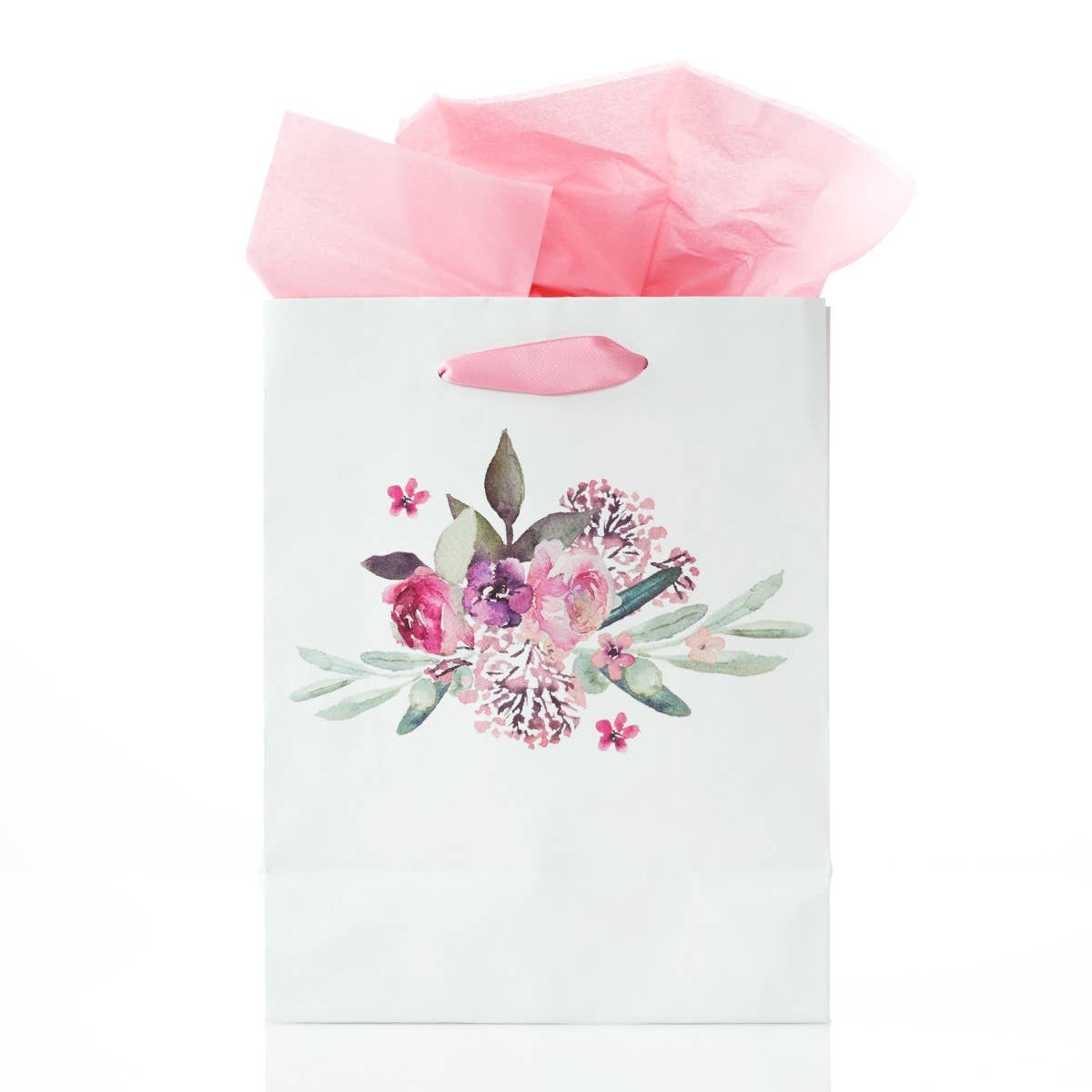 "Rejoice always, pray continually, give thanks in all circumstances; for this is God’s will for you in Christ Jesus." 1 Thessalonians 5:16-18 This gift bag is a part of our Rejoice Collection and makes the perfect gift packaging for inspiring a joyful heart. The floral water color design on the front is vibrant and colorful, emulating the phrase printed directly on the bag which is, “Be joyful always”. The Rejoice Collection includes a set of 4 mugs, journals, water bottle, cutting board, key ring, and magnets. All items are sold separately but together make a lovely gift for a birthday, housewarming or hostess gift.  Size: 9.7” x 7.7” x 4.1” (246 x 196 x 104mm), Satin ribbon handles, Matching gift tag, 1 sheet of tissue paper