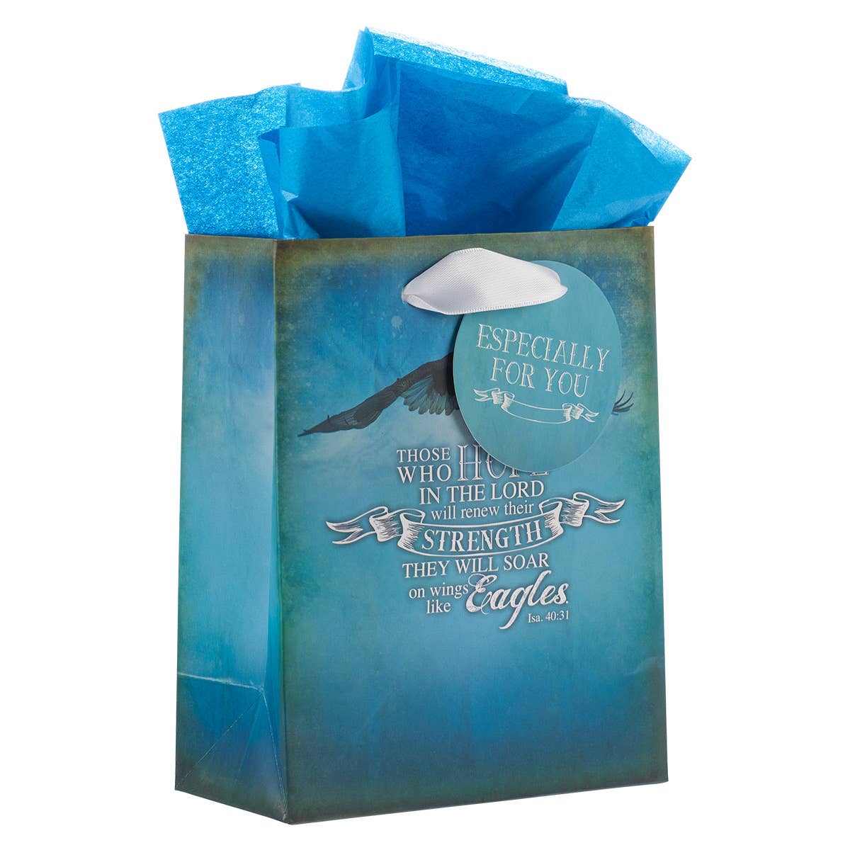 A handsome gift bag designed in blue with a soaring eagle and Scripture verse from Isaiah 40:31, "Those who hope in the Lord will renew their strength. They will soar on wings like eagles". A round gift tag is imprinted with the words, "Especially for you".Perfect for thank you gifts, birthdays, graduations, Father's Day, or just because...