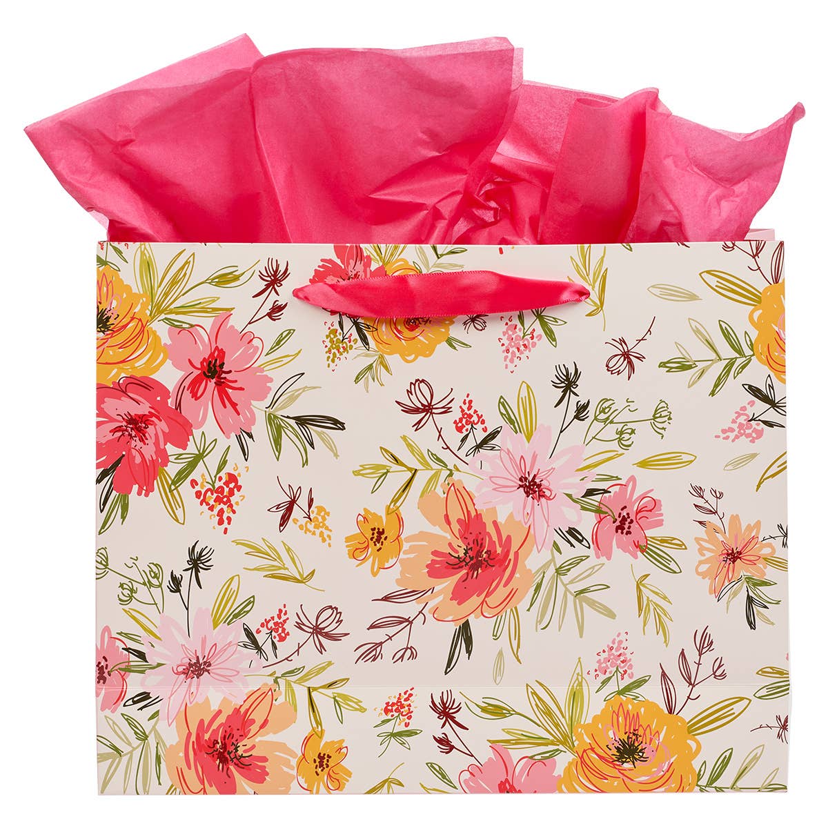 Berry pink and white background with floral design, Pink-foiled text, The Lord delights in you., Isaiah 62:4, Soft rose-pink satin ribbon handles, Two sheets of rose-pink tissue paper included, Coordinating blank card, Pink with orange and pink flowers, Pink and White UV-embossed text, The Lord delights in you, Isaiah 62:4, Matching pink envelope included, Card size: 6" x 4" (152 x 102mm), Gift bag size: 12.5" x 10" x 3.9" (318 x 254 x 99mm)
