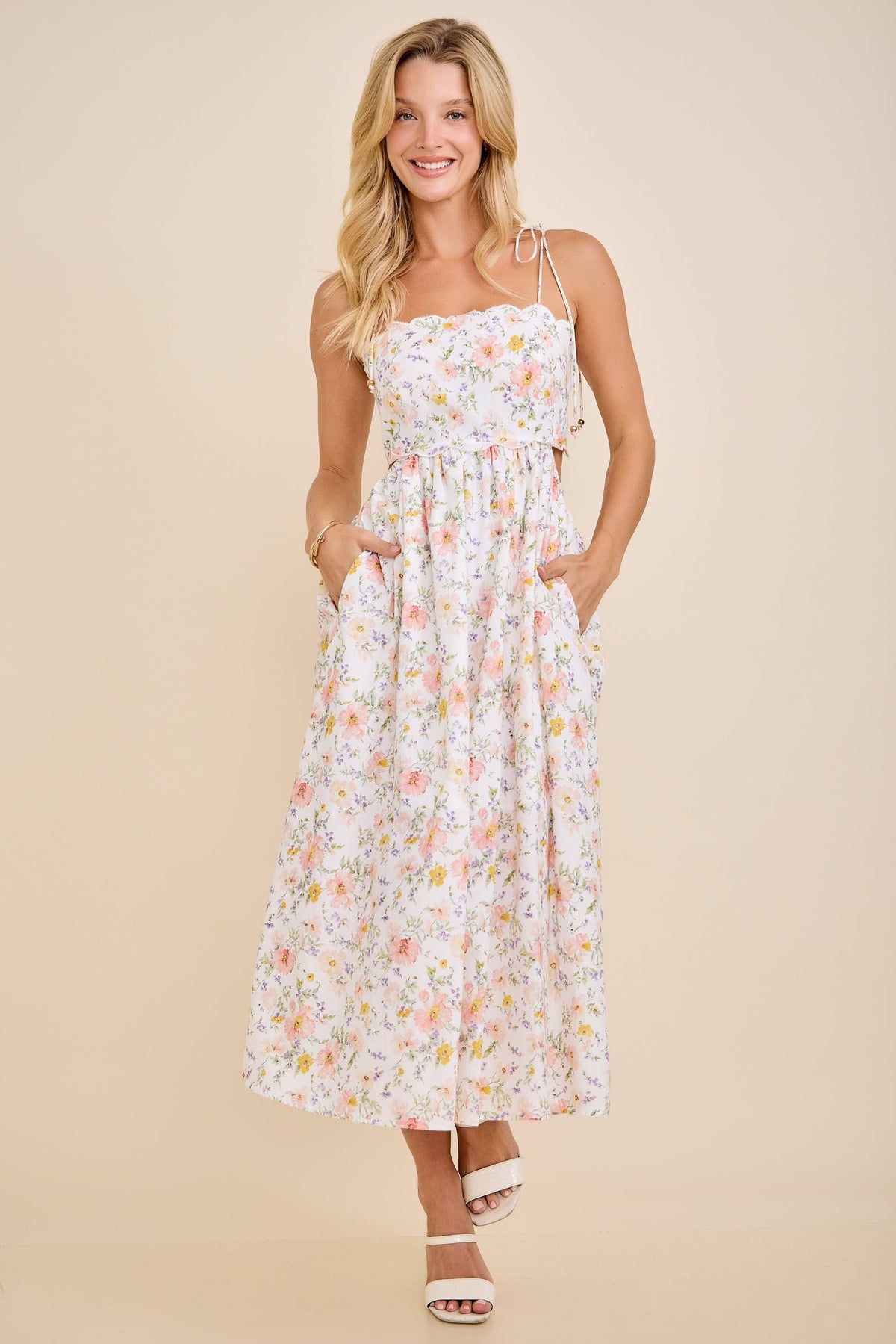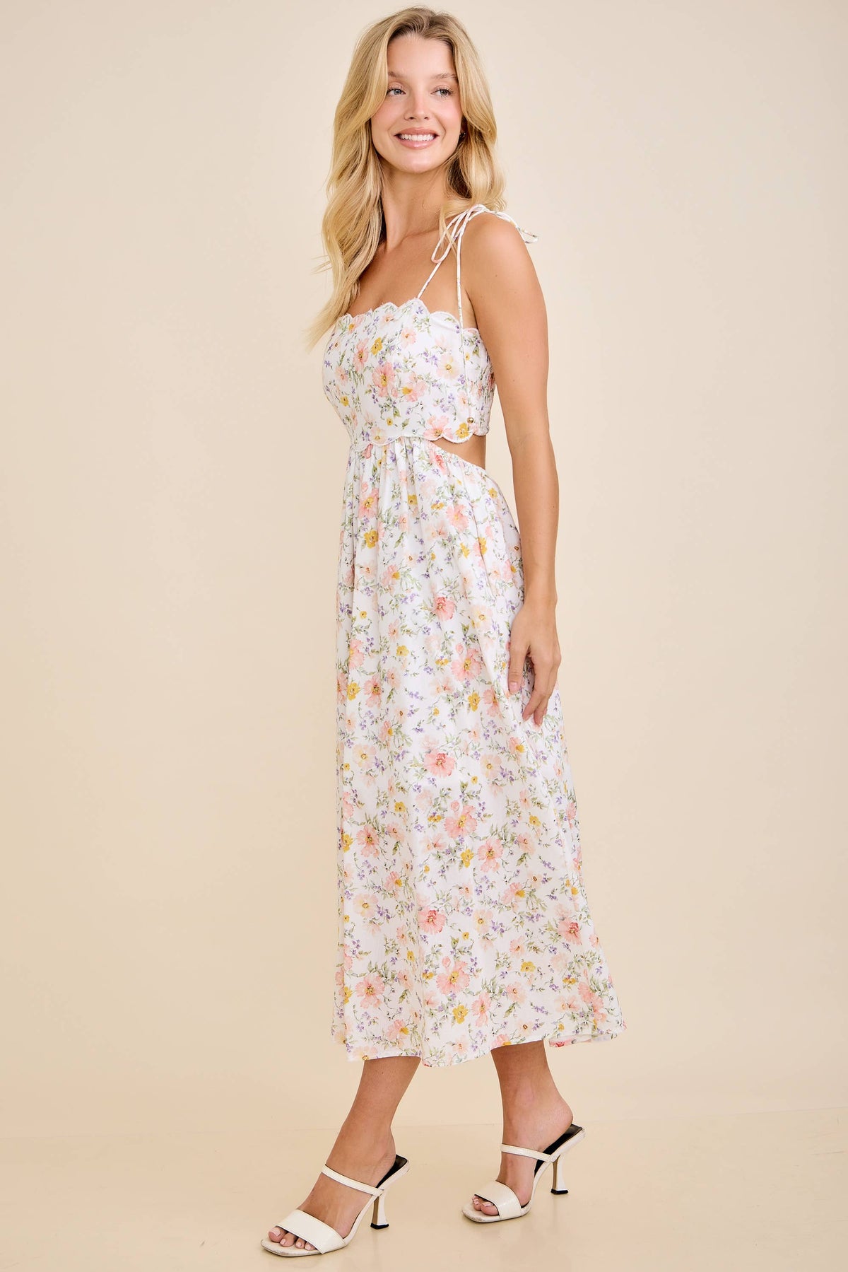 Scallop Edge Tie Shoulder Floral Midi Dress