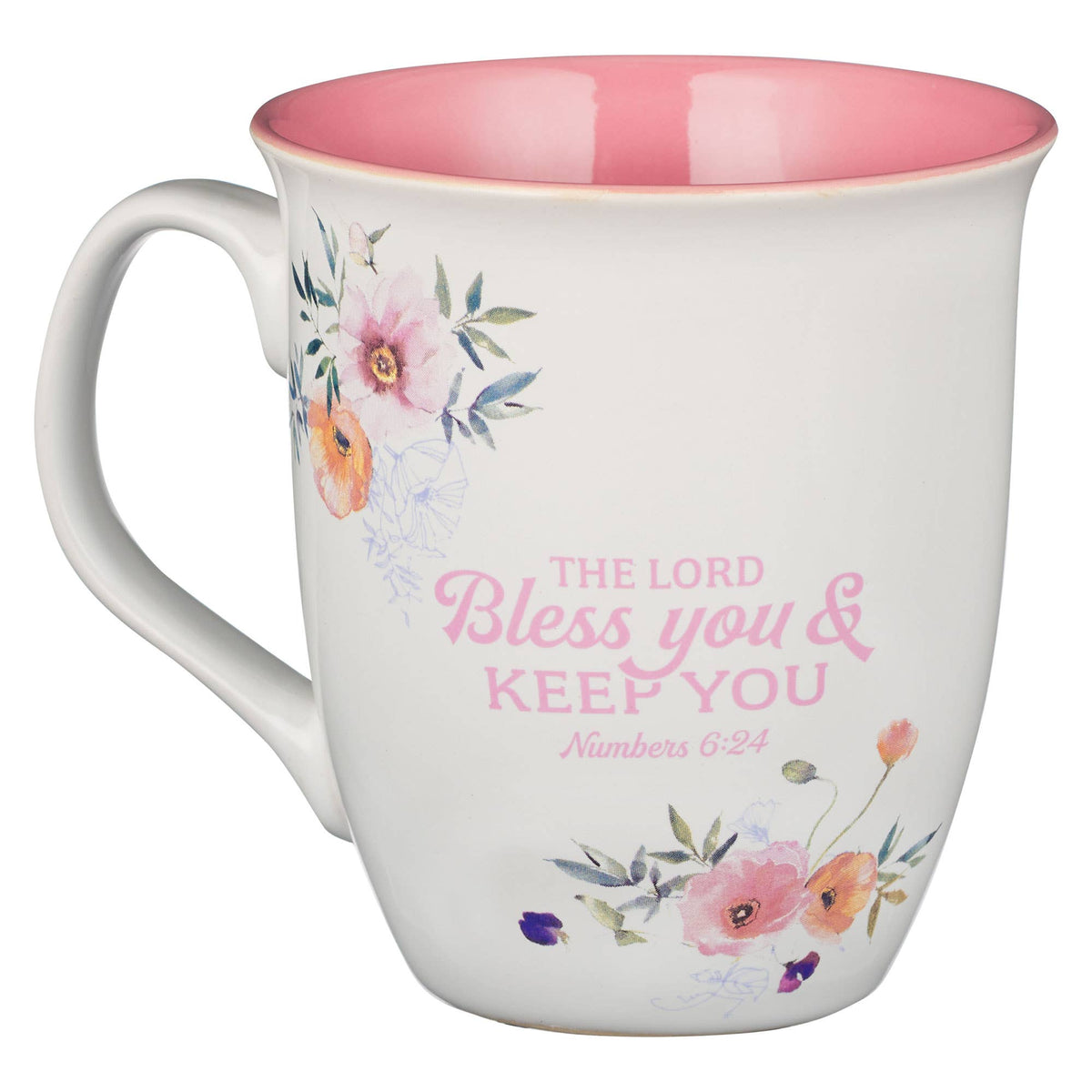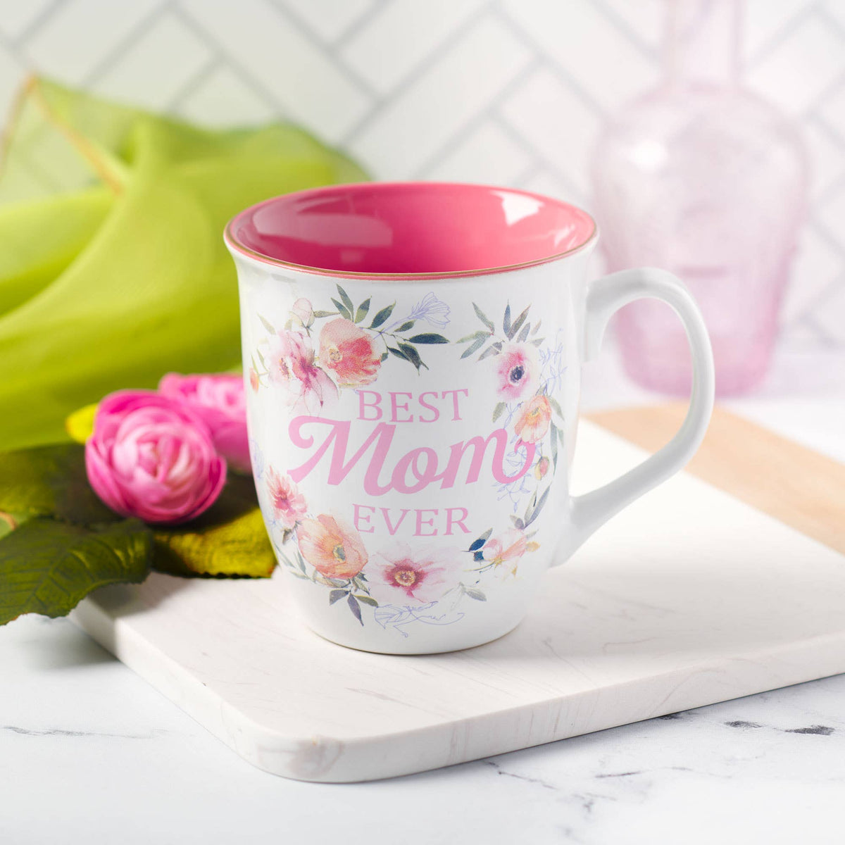 Remind your mom of the everlasting bond you share when you present her when you give the Best Mom Ever White and Pink Ceramic Coffee Mug for Mother's Day. This thoughtful gesture will be a daily reminder of your love and appreciation during her morning coffee moments. Show her how much she means to you, and make her day brighter with this unique mug. White background with spring floral wreath, Pink screen-printed text, Best Mom Ever, Scripture verse on the back in pink letters, The Lord bless you and keep you, Numbers 6:24, Bless You and Keep You Mom Collection, Ceramic mug, Pink interior, Not microwave and dishwasher safe due to delicate foil, Handwash recommended, Packaged in a tuck-top Kraft cardboard box, Mug dimensions: 4.4" x 5.2" x 3.9" (112 x 132 x 99mm), Packaging dimensions: 4.5" x 4.9" x 4.1" (114 x 124 x 104mm), Capacity: 14 fl. oz. (414ml)