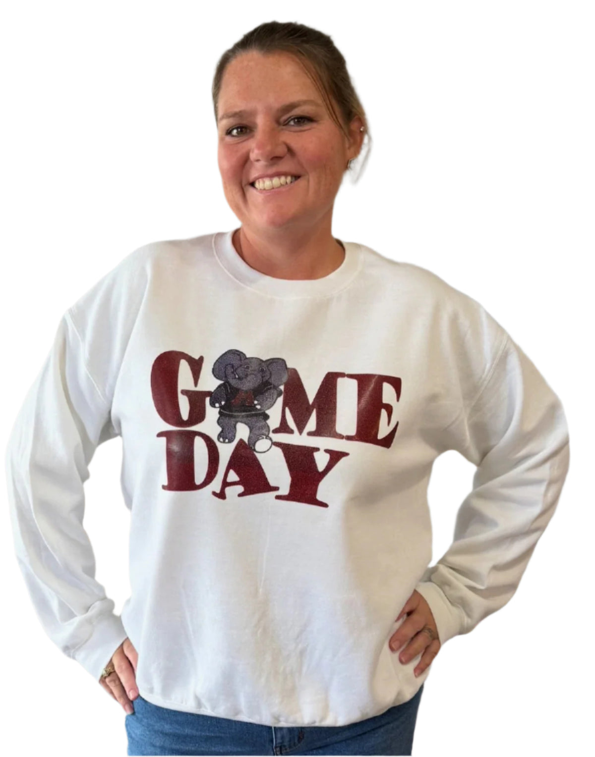 Game Day White Cotton Blend Sweatshirt with Elephant Graphic Print, Casual Crew Neck, Long Sleeve, Burgundy Text Design