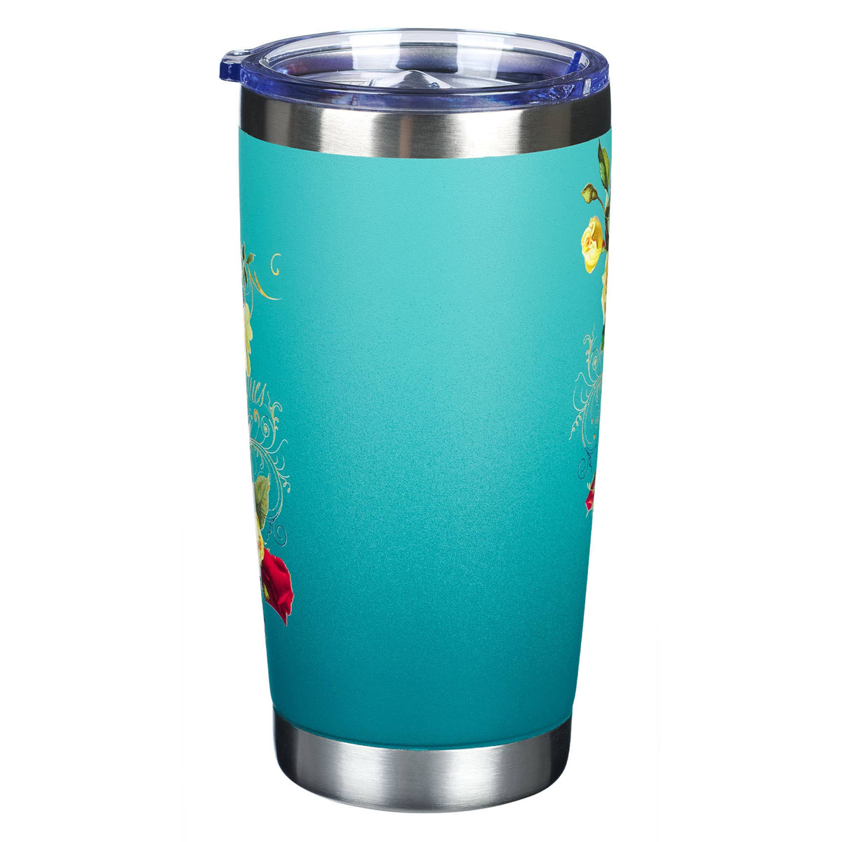 Teal background with yellow, black, and blue butterfly among florals, Stainless steel travel mug, Cream-colored screen-printed letters, Hope, Isaiah 40:31, Teal Secret Garden Hope Collection, Double-wall insulated stainless steel interior, Glossy raised finish, Powder-coated, Hot or cold beverages, Maintains temperature for 24 hours, Not dishwasher, microwave, or freezer safe, Handwash recommended, Packaged in a tuck-top Kraft cardboard box, Capacity: 18 fl. oz. (532ml), Mug dimensions: 6.9" x 3.7" x 3.5" ( 175 x 94 x 89mm), Packaging dimensions: 7.3" x 3.7" x 3.7" (185 x 94 x 94mm)