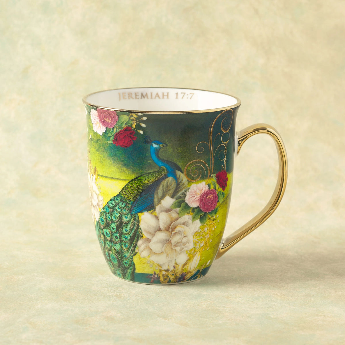 Celebrate and pay tribute to the extraordinary life of a beloved matriarch by gifting her the exquisite Blessed Blue Peacock Ceramic Coffee Mug on her special day. This heartfelt gesture honors her remarkable legacy and serves as a token of appreciation for her enduring impact. Green and teal background with blue peacock and florals, Gold-foiled accents and text, Blessed, Jeremiah 17:7, Blessed Blue Peacock Secret Garden Collection, Ceramic mug, Metallic gold rim and handle, Interior text, Jeremiah 17:7, Creamy-white interior, Not microwave and dishwasher safe due to delicate foil, Handwash recommended, Packaged in a tuck-top Kraft cardboard box, Mug dimensions: 4.4" x 5.2" x 3.9" (112 x 132 x 99mm), Packaging dimensions: 4.5" x 4.9" x 4.1" (114 x 124 x 104mm), Capacity: 14 fl. oz. (414ml)