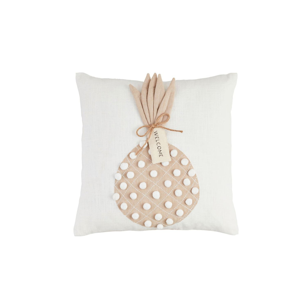 Chambray applique cotton slub pillow with pom detail. Canvas backing with zipper closure.