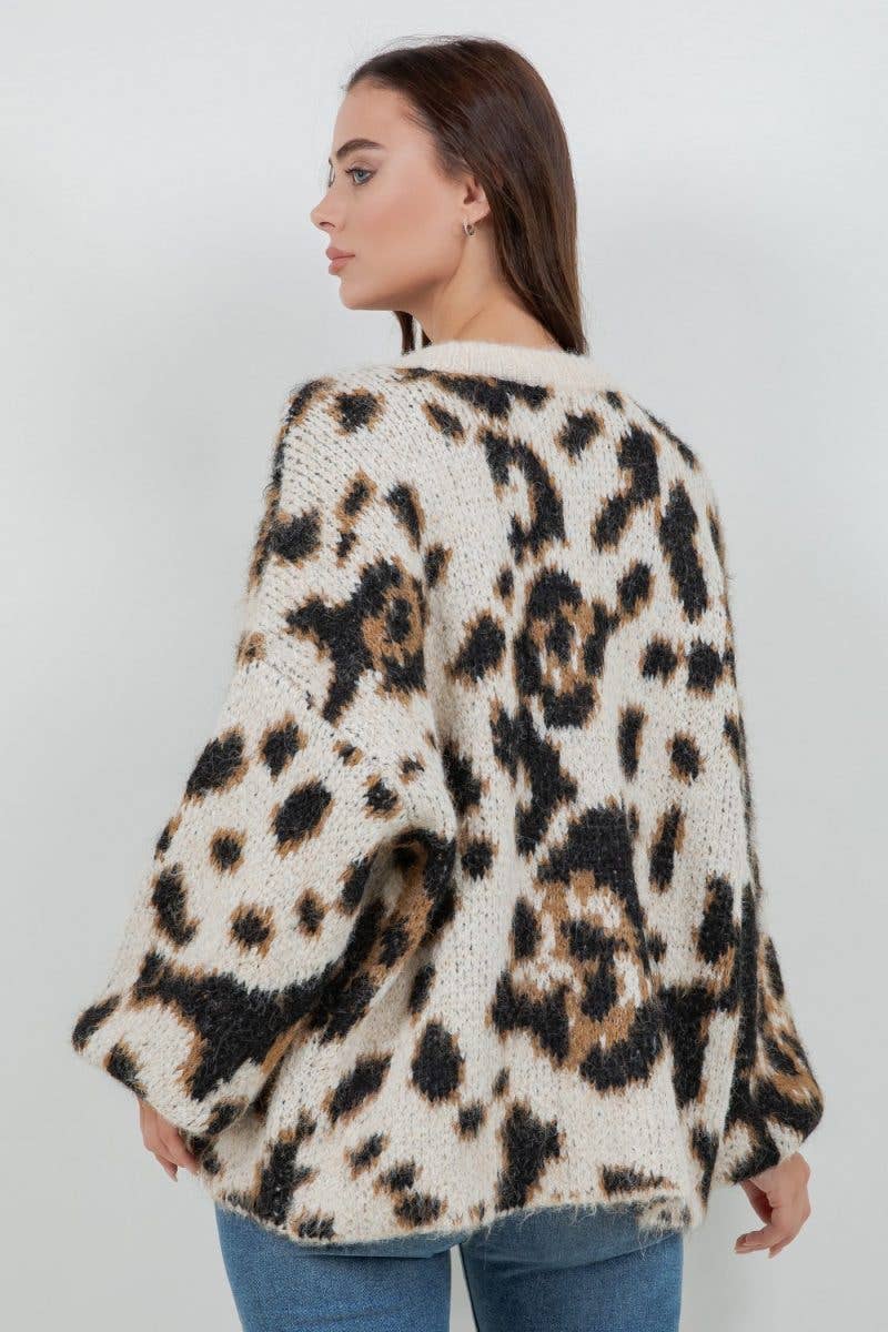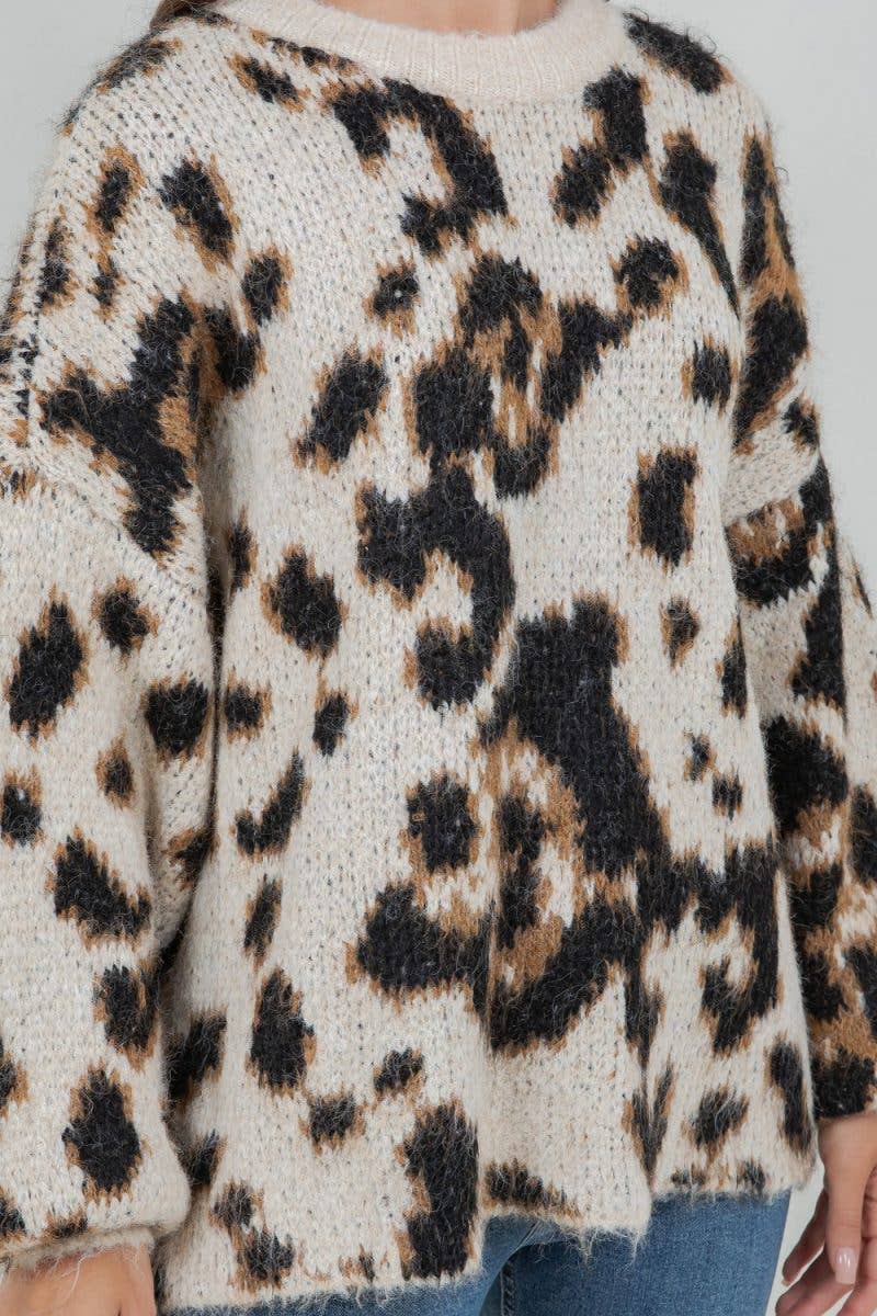 A bold and cozy pullover sweater featuring an oversized leopard print design in warm neutral tones. Designed with statement balloon sleeves, a relaxed fit, and ribbed trim for added comfort.