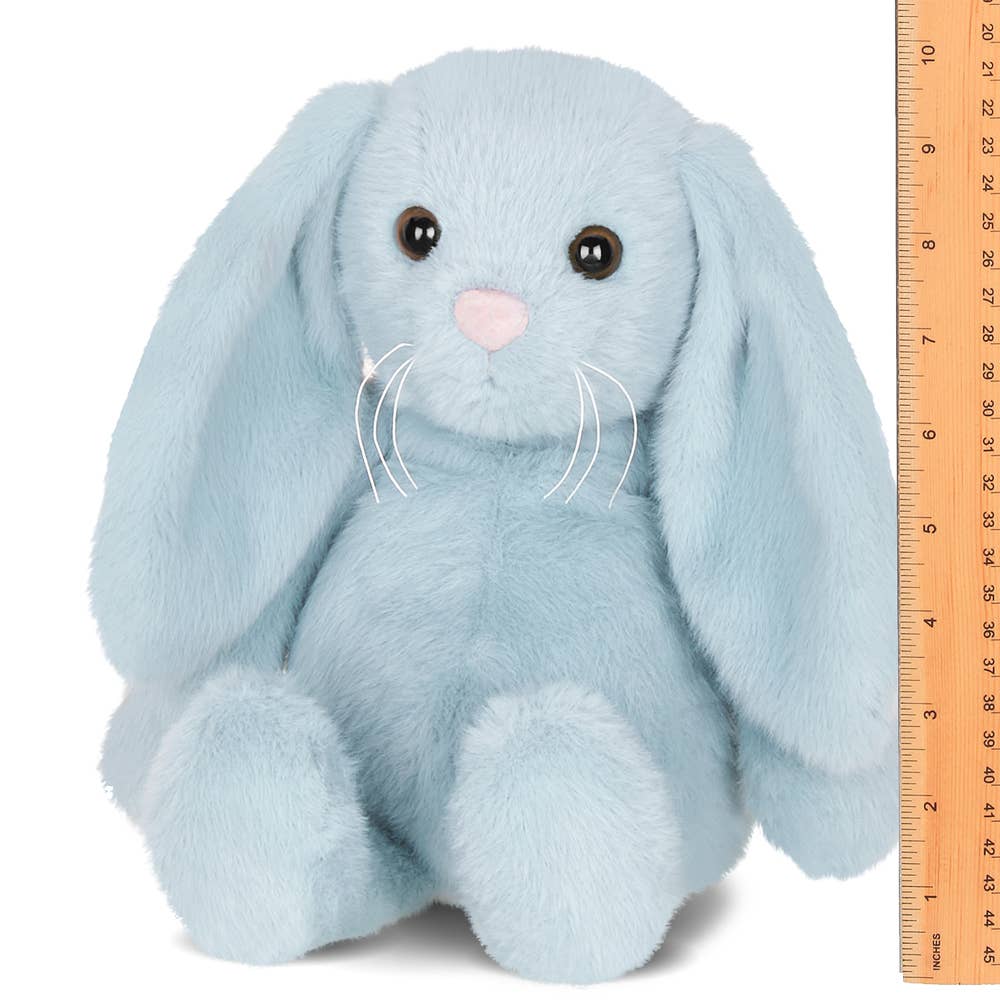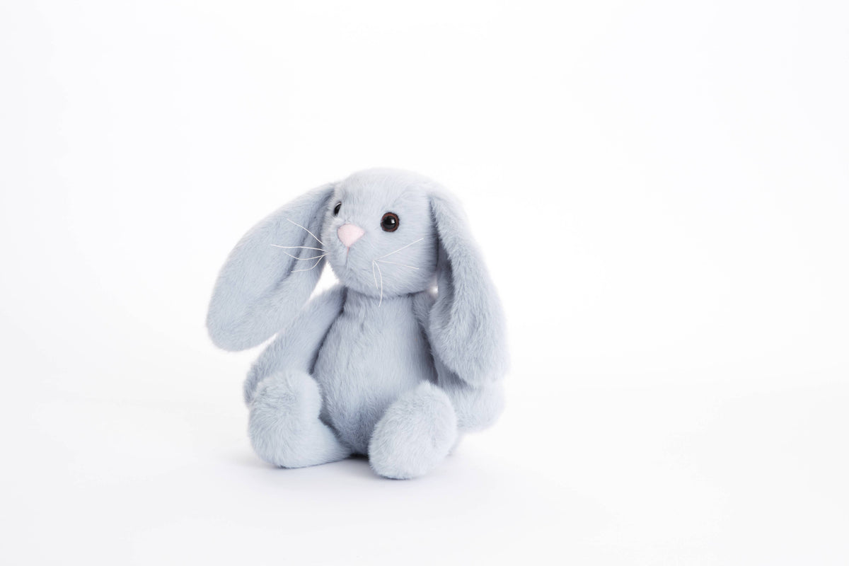The softest light blue plush fur and floppy body with delicately soft stuffing make this bunny a cuddly companion!