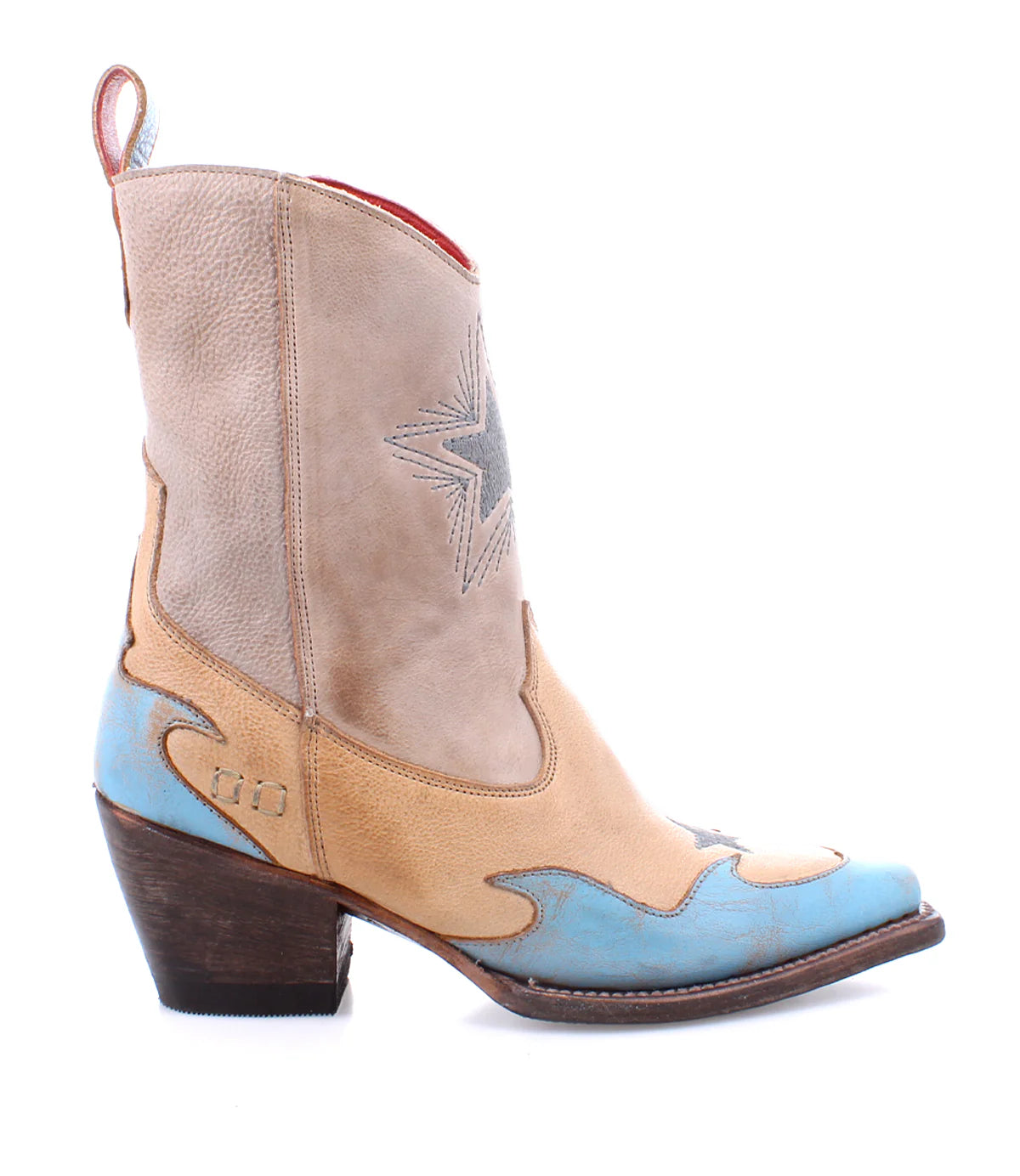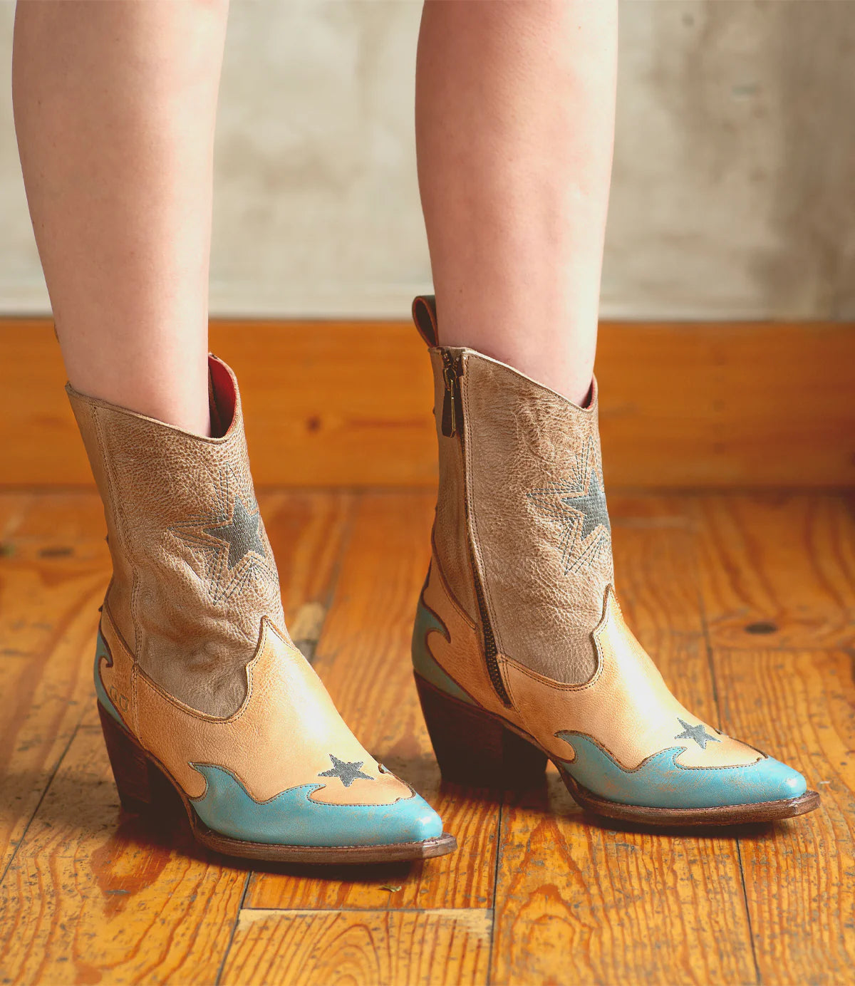 Hyperspeed is a western-inspired leather boot, handcrafted from vegetable-tanned leather. This standout pair features three distinct leather finishes, adding a touch of artistry to your ensemble. The boots are elevated with leather stacked heels and meticulously constructed using Goodyear welt for enduring quality. With a convenient side zipper, slipping into these boots is effortless, ensuring both style and ease of wear.