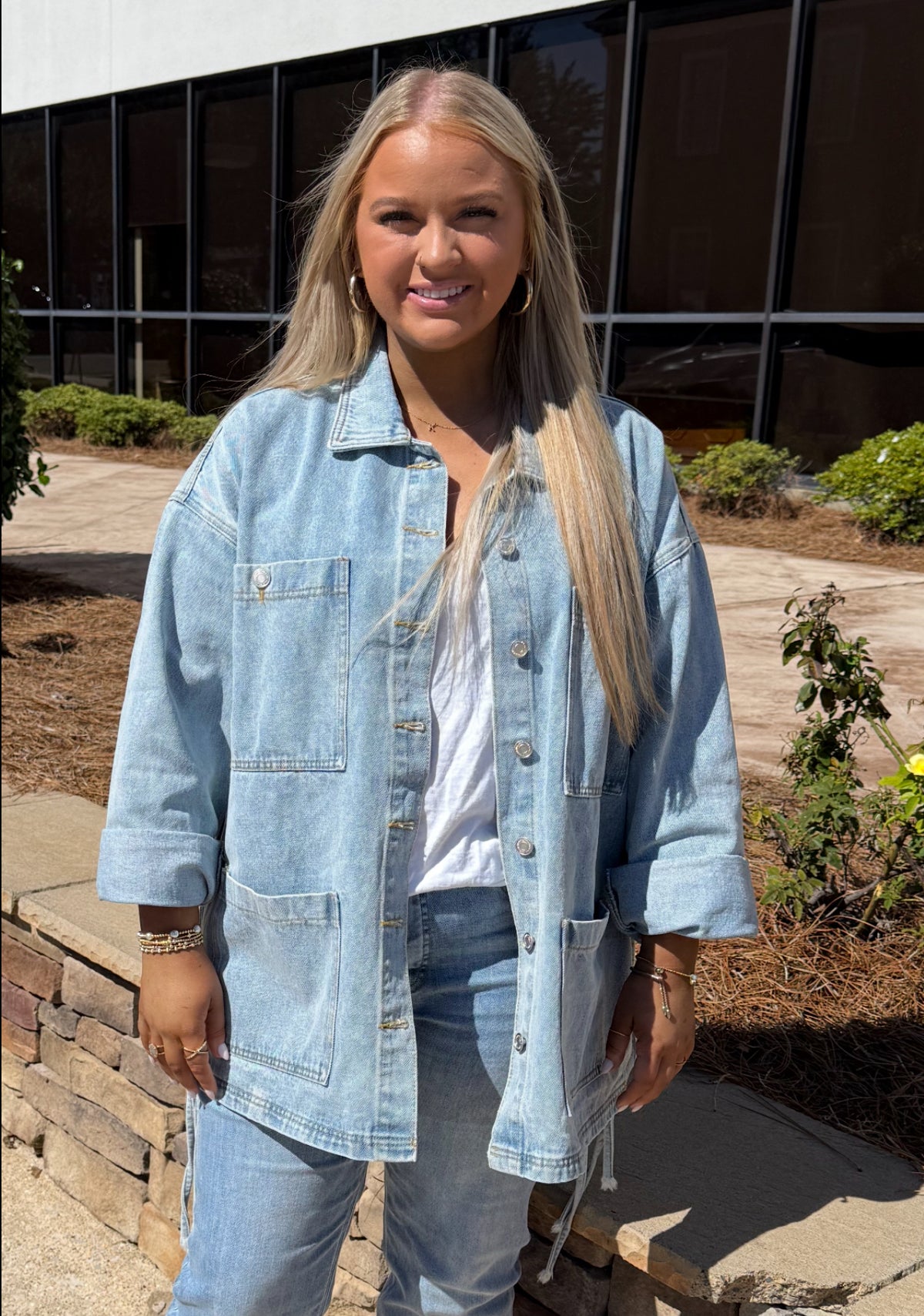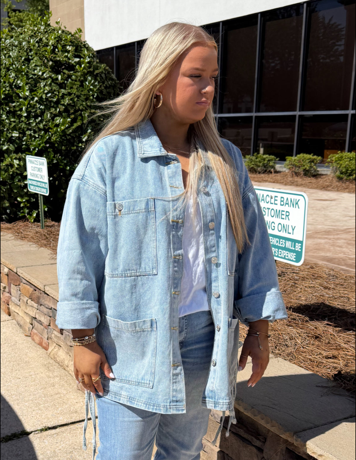 • Oversized Boyfriend Denim Jacket with Front Pockets and Side Tie Up Detail