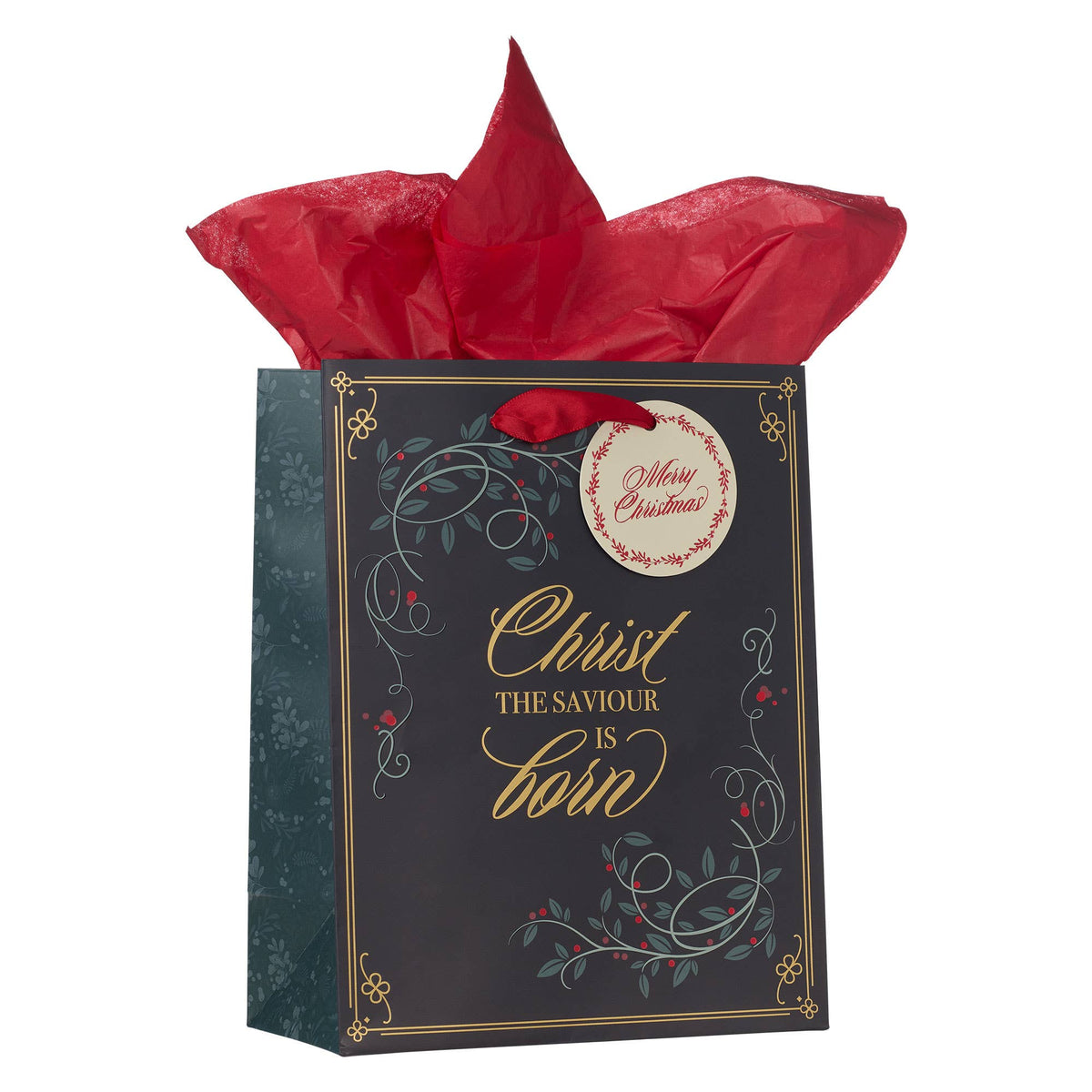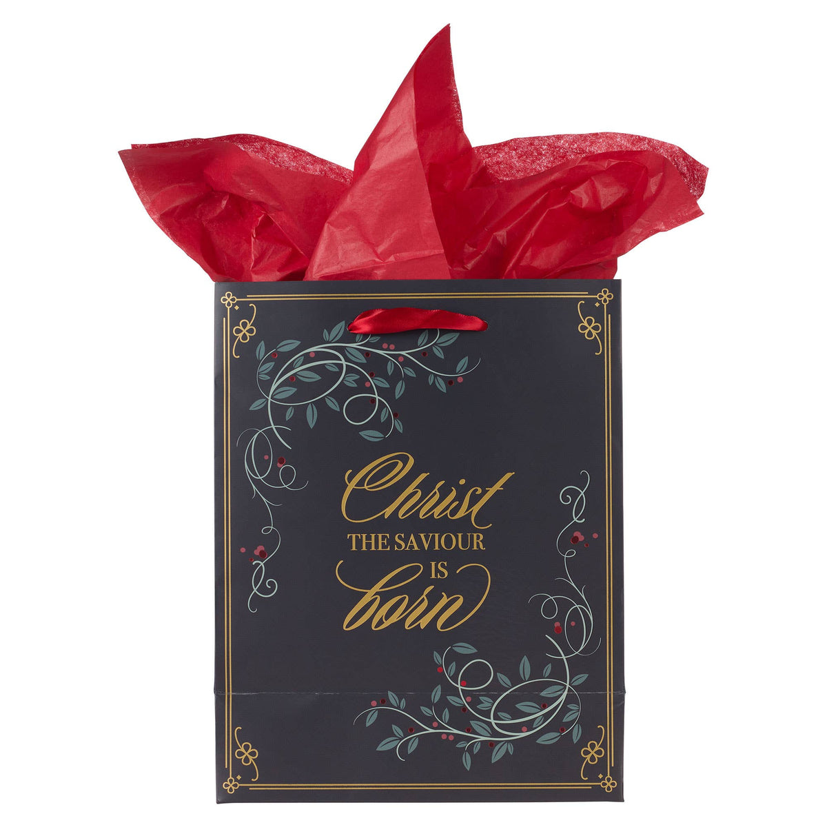 Prepare to share the Christmas message with wrapping paper and bags that carry the Christmas message. Bags like the Christ the Savior is Born Red Berry Medium Gift Bag are designed to reflect the true spirit of Christmas.  Silver-foiled botanical swirls and red berries, Matte black background, Gold-foiled text,  Christ the Saviour is Born, Round white gift tag, Red berry wreath and red sentiment, Merry Christmas Medium-sized gift bag,  Two sheets of bright red tissue paper included,   Red satin ribbon handles,   Size: 9.7" x 7.7" x 4.1" (246 x 196 x 104mm)