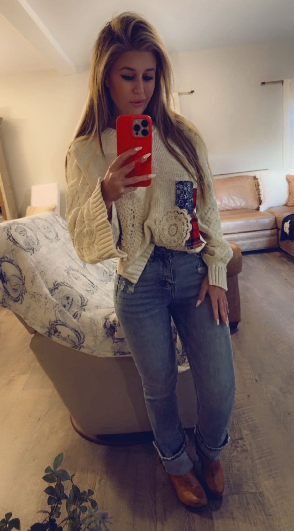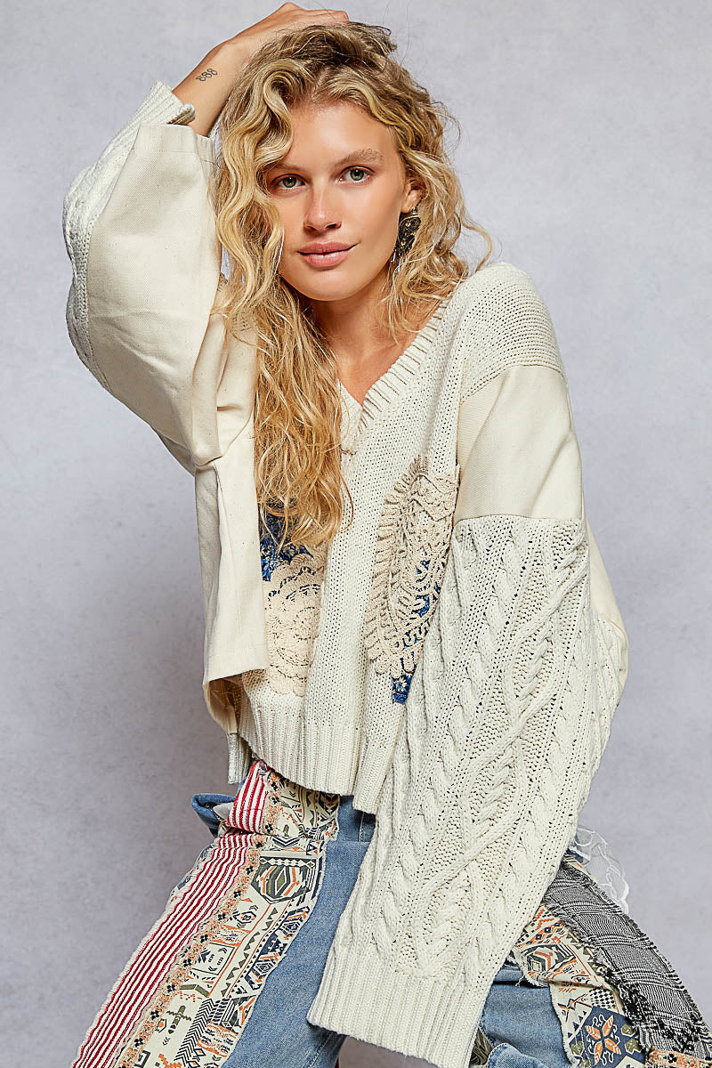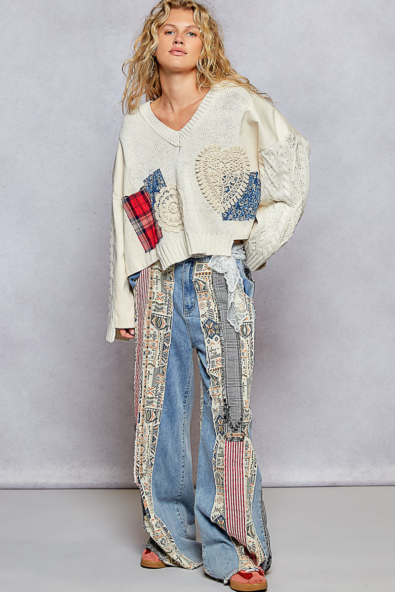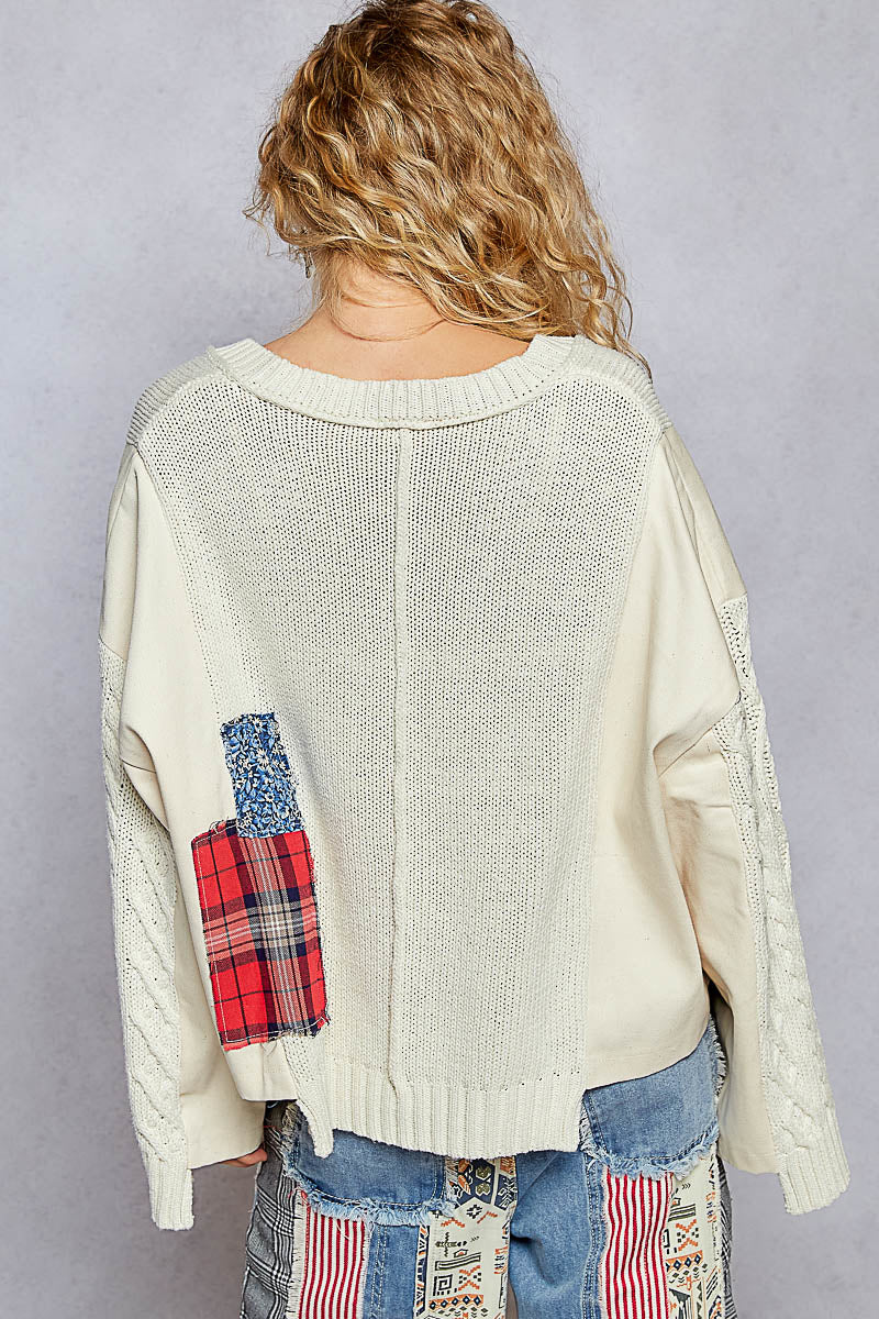 Designed in V-neck, straight sleeve, oversized fit top in sweater and twill mix with patch detail pointed solid pattern.