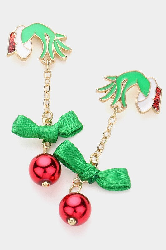Enamel Grinch Hand Bow Bell Dropdown Earrings