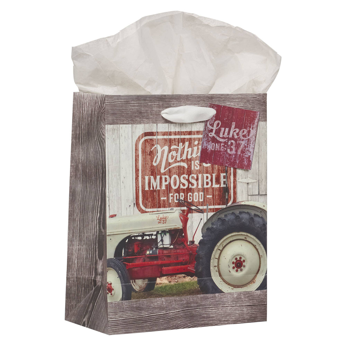 Farm scene with vintage red tractor, White printed text, Nothing is impossible for God, Luke 1:36, Nothing is Impossible Red Farm Collection, Medium-sized gift bag, Two sheets of white tissue paper included, White satin ribbon handles, Attached square gift tag, Size: 9.7" x 7.7" x 4.1" (246 x 196 x 104mm)