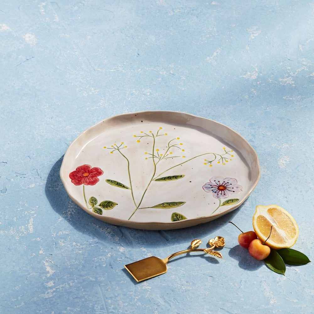 Flower Round Platter Set. This exquisite 2-piece set features a beautifully hand-painted stoneware platter, perfect for adding a touch of elegance to any dining experience. The platter, with its generous 11-inch diameter, provides ample space for serving a variety of dishes, from appetizers to desserts. Accompanying the platter is a stylish brass plate metal spatula, measuring 6 inches, designed for both functionality and aesthetic appeal. Crafted from durable stoneware, this set is not only a practical addition to your kitchen but also a charming decorative piece that enhances your table setting.