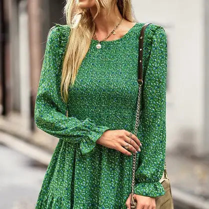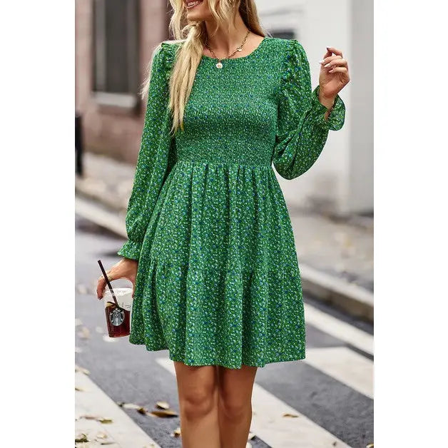 100% Polyester, the material is breathable, lightweight fabric, soft and comfy. Feature: Long Sleeve, Smoked, High Waisted, Ruffle Sleeve, Short Dress, Round Neck.