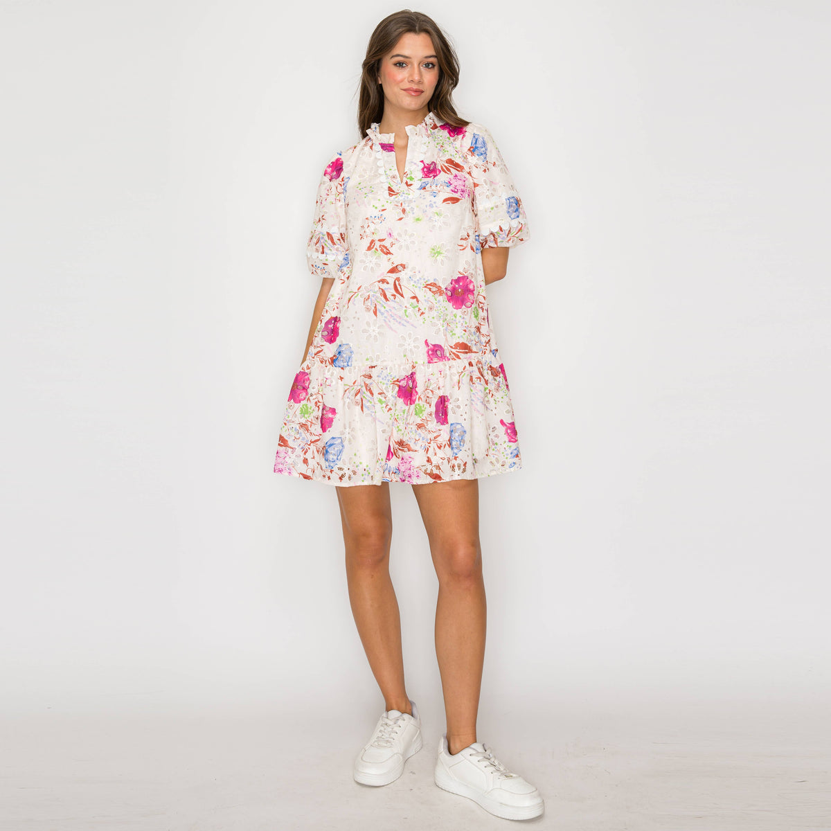 - Pink flower print on punch eyelet fabric - Stand collar with lace trim - Bubble sleeves - Full lining