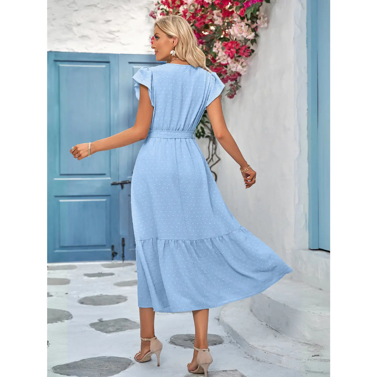 Lace Trim Swiss Dots Surplice Belted Midi Dress