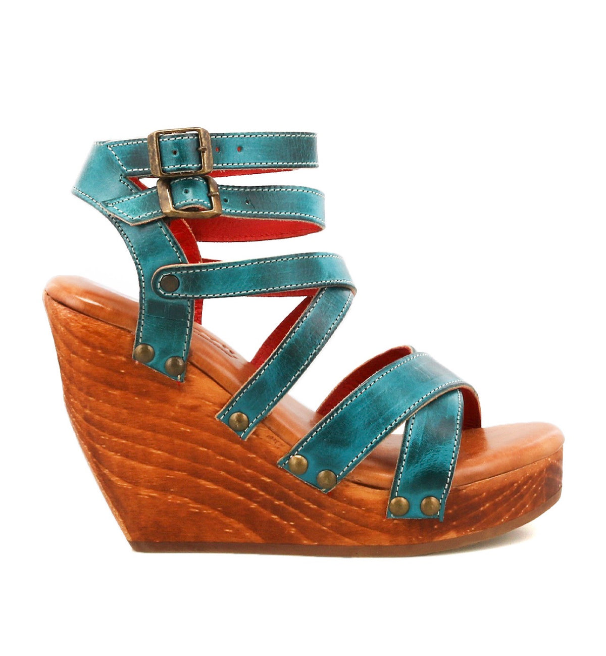 Juliana II, a fresh take on a beloved classic. We’ve updated the original with a cushioned, comfy wedge and a “naked” wooden heel, removing the leather wrap for a sleek, natural look that exposes the beautiful Chilean pine wood grain. Featuring adjustable buckles, a strappy studded upper, and the same artisanal hand-finishing, Juliana II effortlessly blends modern elegance with timeless charm.