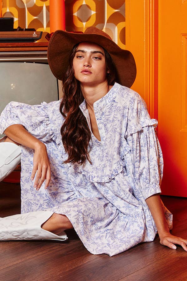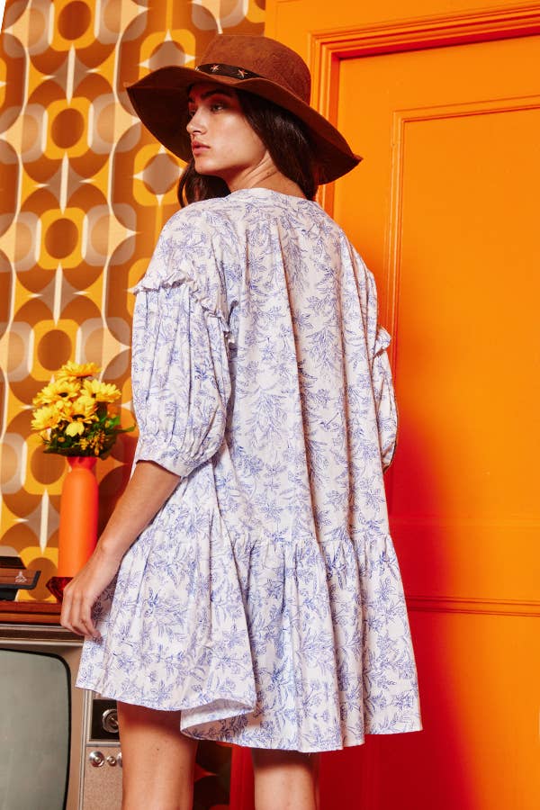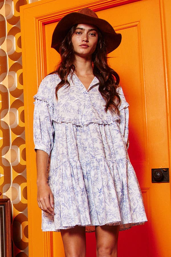 Button Up Stand Collar Ruffle Tiered Floral Mini Dress
