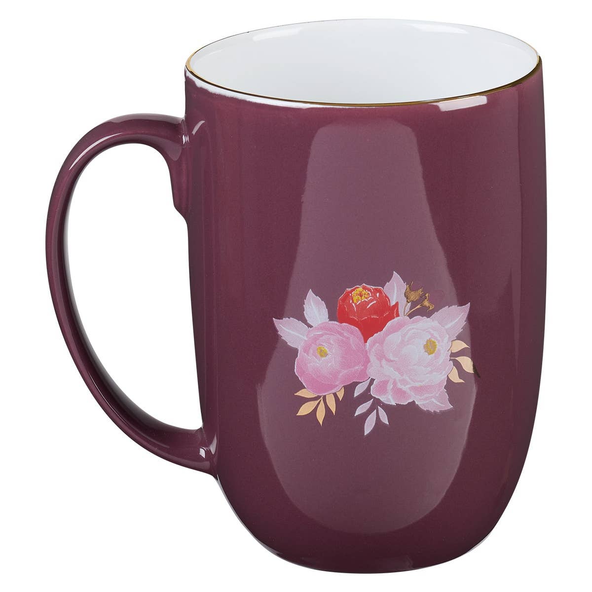 The Amazing Grace Mulberry Pink Ceramic Coffee Mug is an inspiring gift and beautiful addition to any kitchen. Women of all ages will cherish this excellent gift with its message of God's goodness. Colorful floral design against a mulberry pink background, Gold foil accents, Amazing Grace, Ceramic mug, Handwash recommended, Not microwave or dishwasher safe due to delicate foil, Packaged in a printed cardboard gift box, Gift box dimensions: 5" x 4.8" x 3.6" (127 x 122 x 91 mm), Capacity 15 fl oz (444 ml)